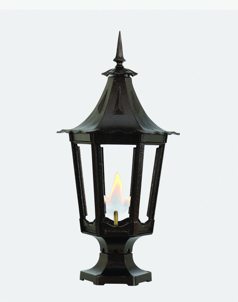 We stock gaslights in black, with dual inverted mantles. Please allow three weeks for delivery of others. Call for pricing on lighting options.