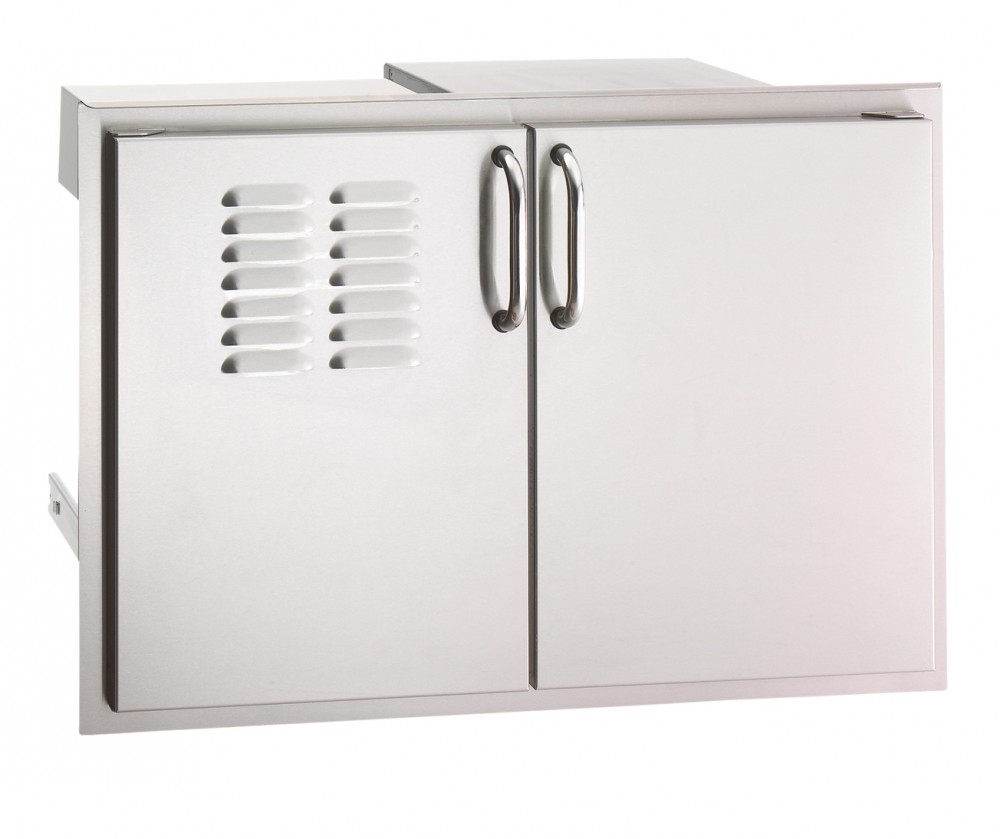Complement your outdoor living area with the finest in quality and practicality, with our Aurora Double Access Door with two drawers and trash tray and louvers. Measures 20 1/2"x 30". Cutout opening 19 1/4"H x 28 1/2"W x 21"D