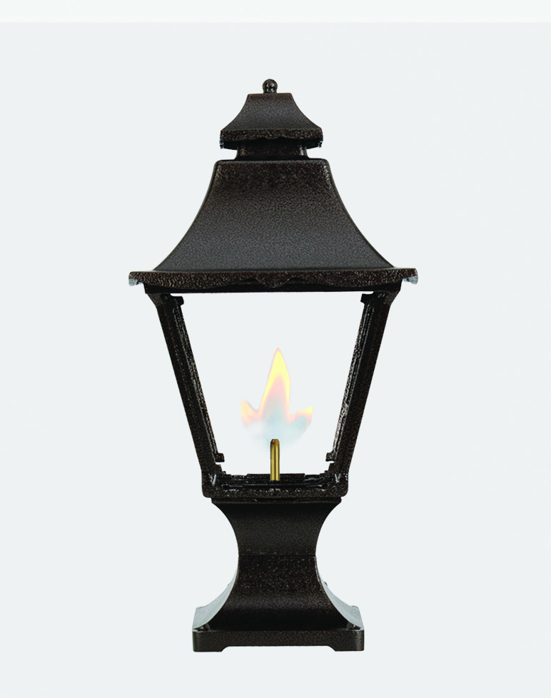 We stock gaslights in black, with dual inverted mantles. Please allow three weeks for delivery of others. Call for pricing on lighting options.