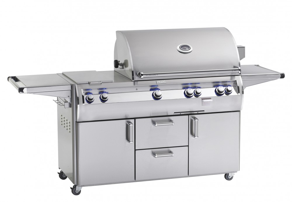 Exclusive Features of The ECHELON DIAMOND E790 include a builtin paper towel holder, backlit safety knobs, contoured control panel, heat zone separators, hot surface electronic ignition, cart has two 110V plug-in electrical outlets with 12V transformer (builtin requires hard wire, cart requires extension cord), dual internal halogen lamps in hood for easier evening grilling, manual tubes for match lighting, builtin analog thermometer, water tight wood chip smoker drawer with dedicated burner, new cast stainless steel "E" burners and stainless steel valve manifold. The newest addition to the Firemagic line. The second largest cooking surface across the line! This grill offers a true 36" across the cooking surface, not the FRAME of the grill like others measure. A total whopping BTU rating of 99,000 on the main cooking surface and a full-length backburner rated at 23,000 BTU's. The total cooking area is almost 800 sq. inches so it can hold just about anything you want to load up!The stainless steel cart features dual storage doors below, a stainless steel prep shelf on the right side, and heavy-duty cart casters for ease of portability. This unit also includes a dual side burner on the left side. Echelon Slide Show.