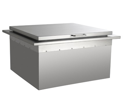 Insulated walls, bottom drain, in-front shelving, attached bottle opener, included drain kit, Echelon styled face and hinged removable lid.