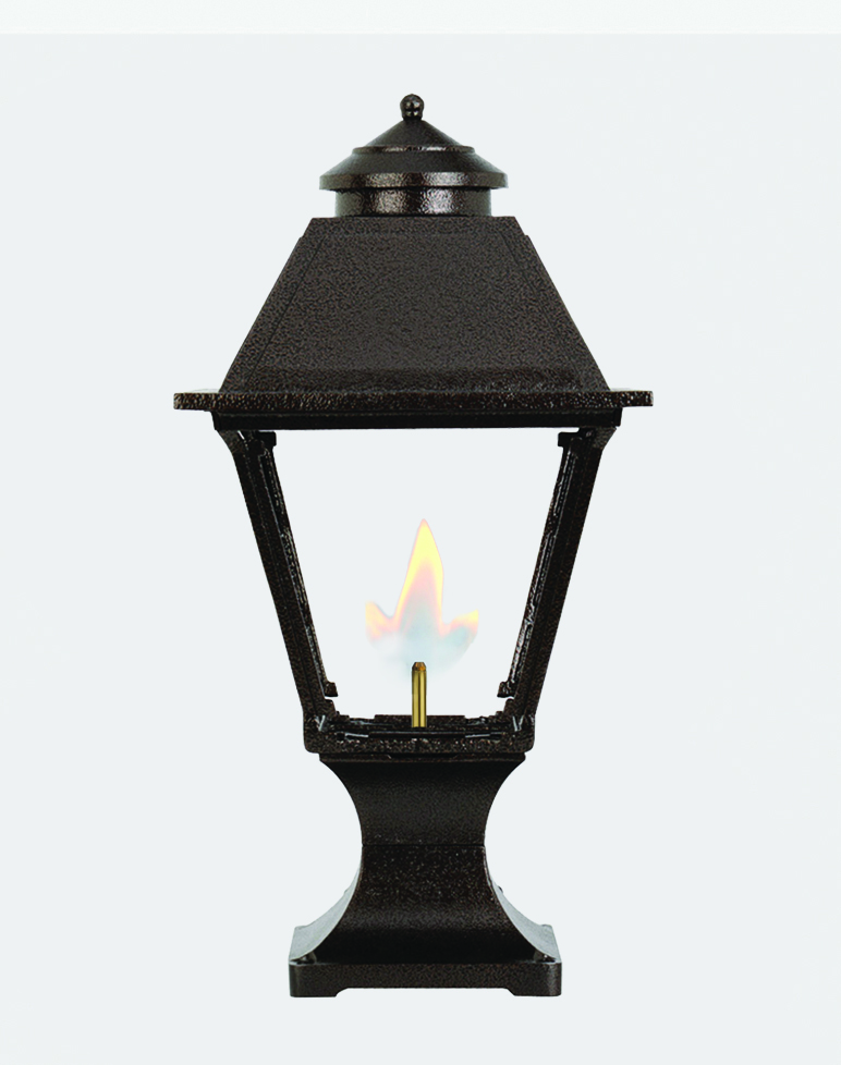 We stock gaslights in black, with dual inverted mantles. Please allow three weeks for delivery of others. Call for pricing on lighting options.